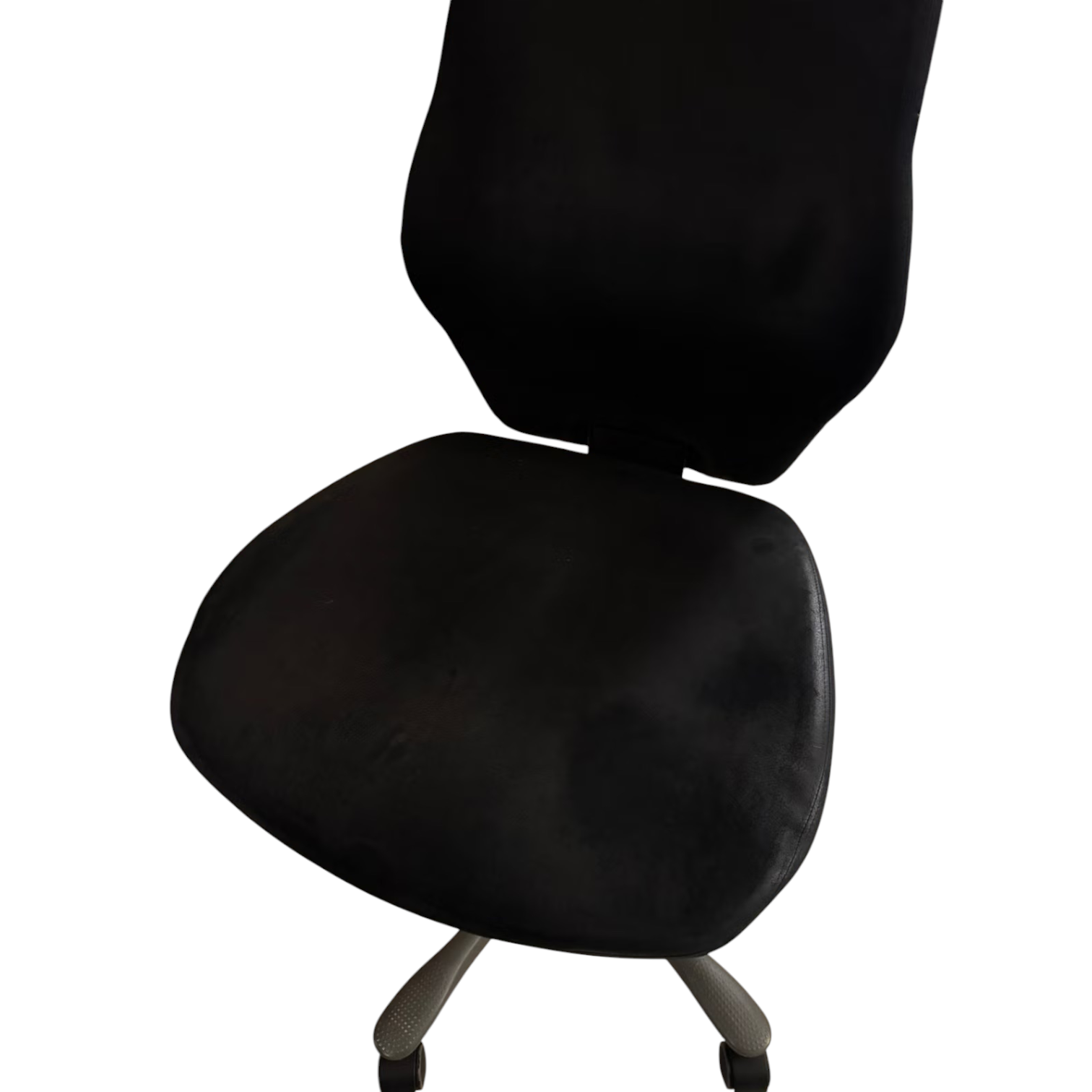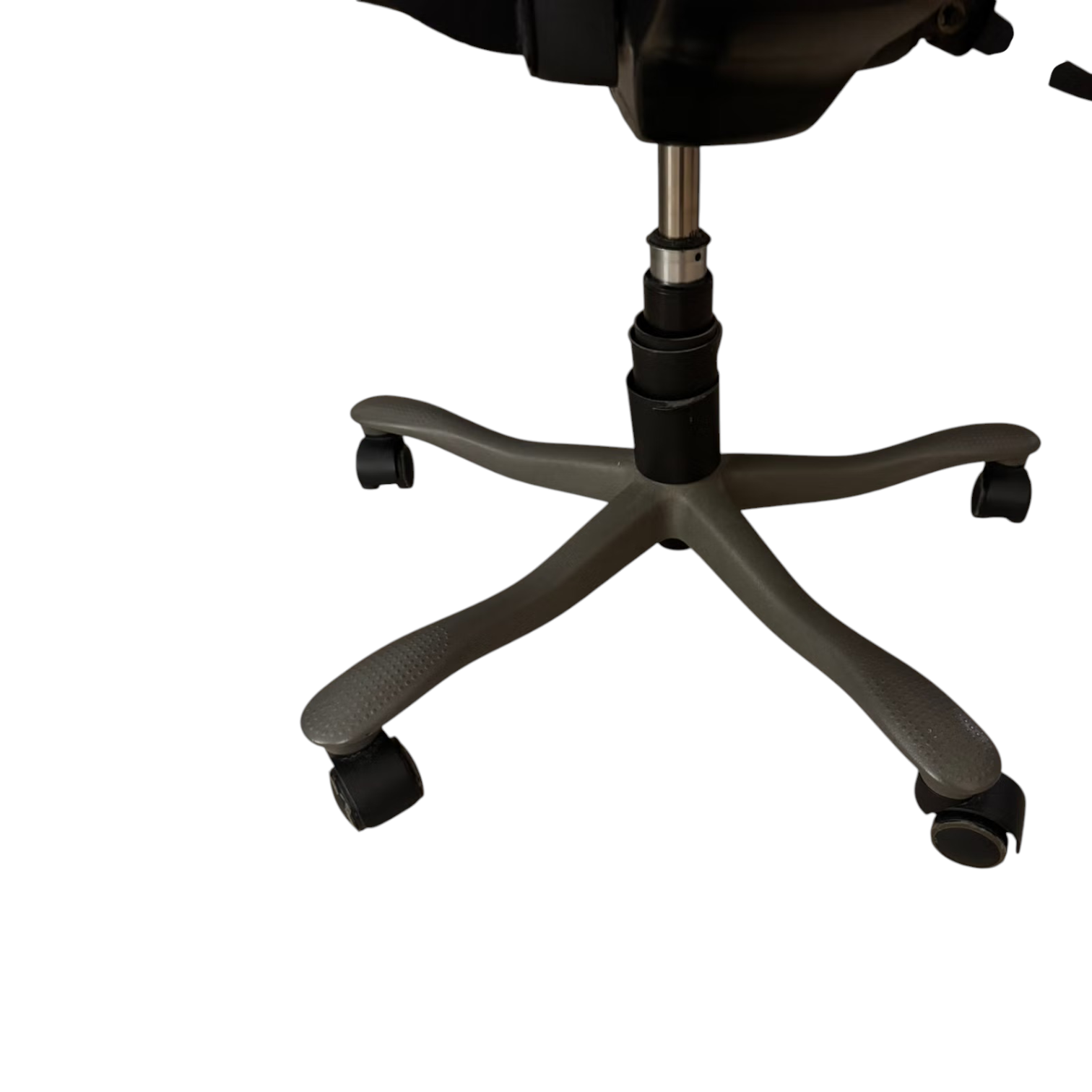Hjulene er slitt og bør byttes for optimal rulling, og Kinnarps-logoen (klistremerket) mangler. Dette er små detaljer som lett kan utbedres, men påvirker ikke stolens funksjon eller komfort.